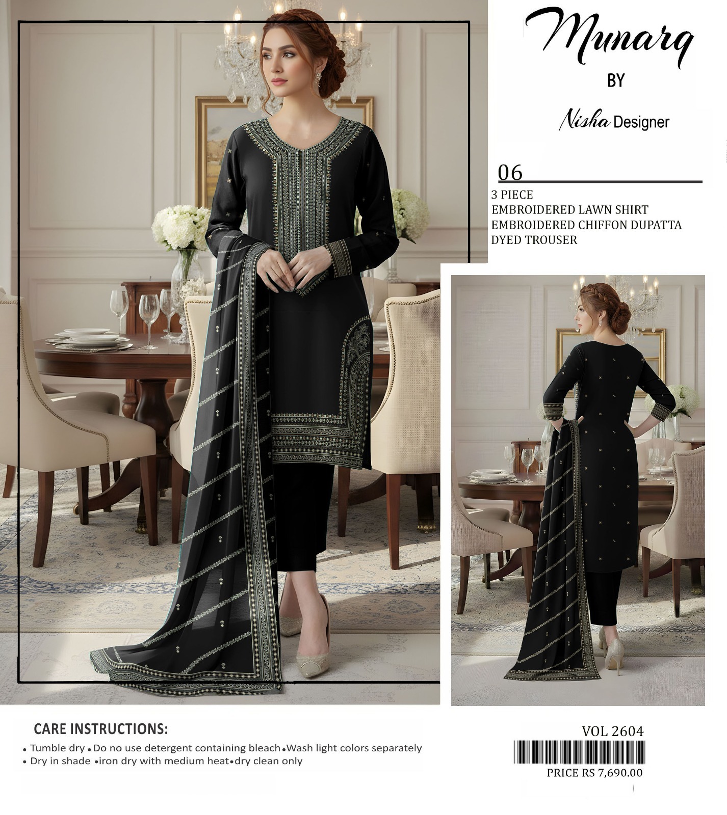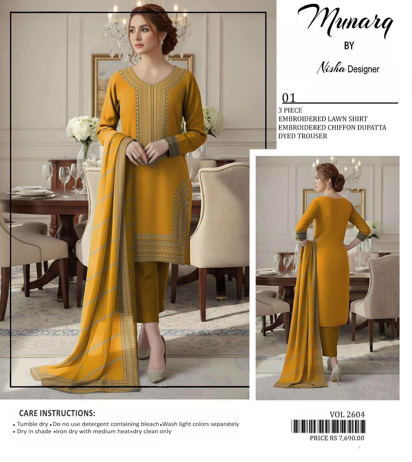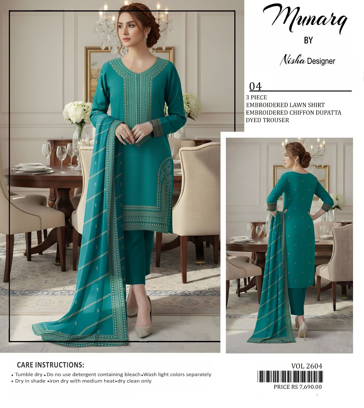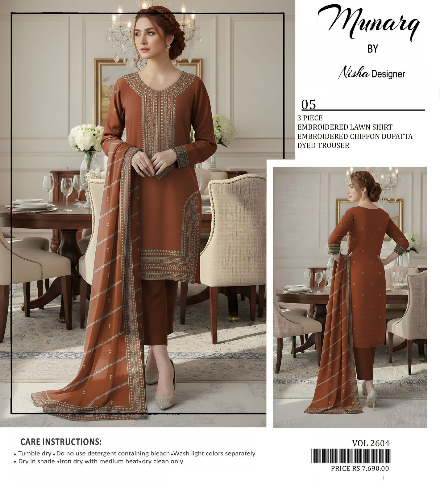 Includes: Embroidered Lawn Shirt + Embroidered Chiffon Dupatta + Dyed Trouser